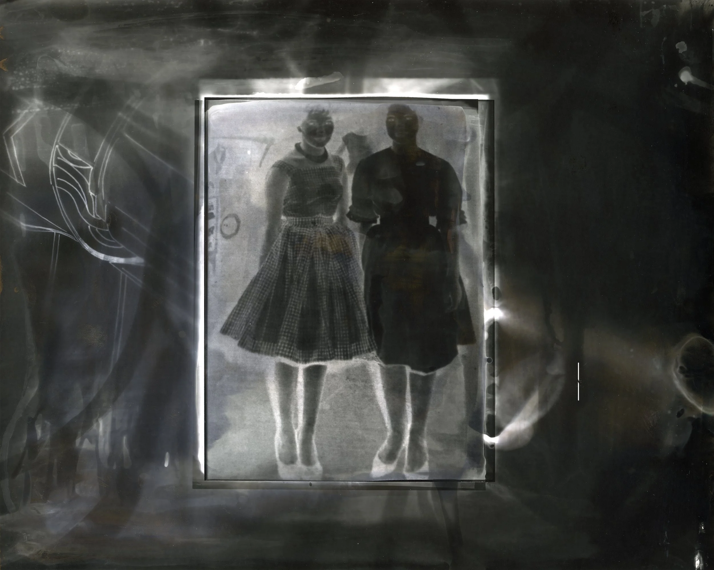 Chelsea Carkeet, Grandma and Aunty Evelyn Out in the City, 2024, chemigram and cliché-verre on silver gelatin print silver gelatin print, exposed 6 seconds, 20.32cm x 25.4cm, photo by artist.