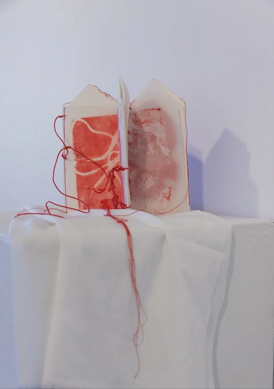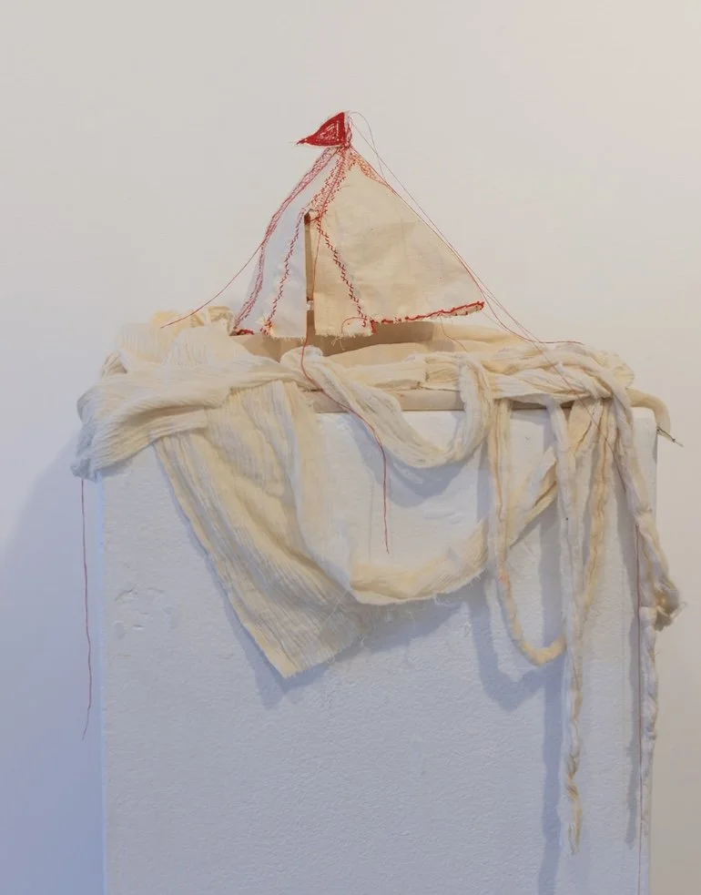 Chelsea Carkeet, Show Business I, 2024, calico, red cotton thread, electrical wire, cotton paper, armature wire, mdf board, dowel, gauze, 20cm x 20cm x 25cm, photo by Robyn Wood.